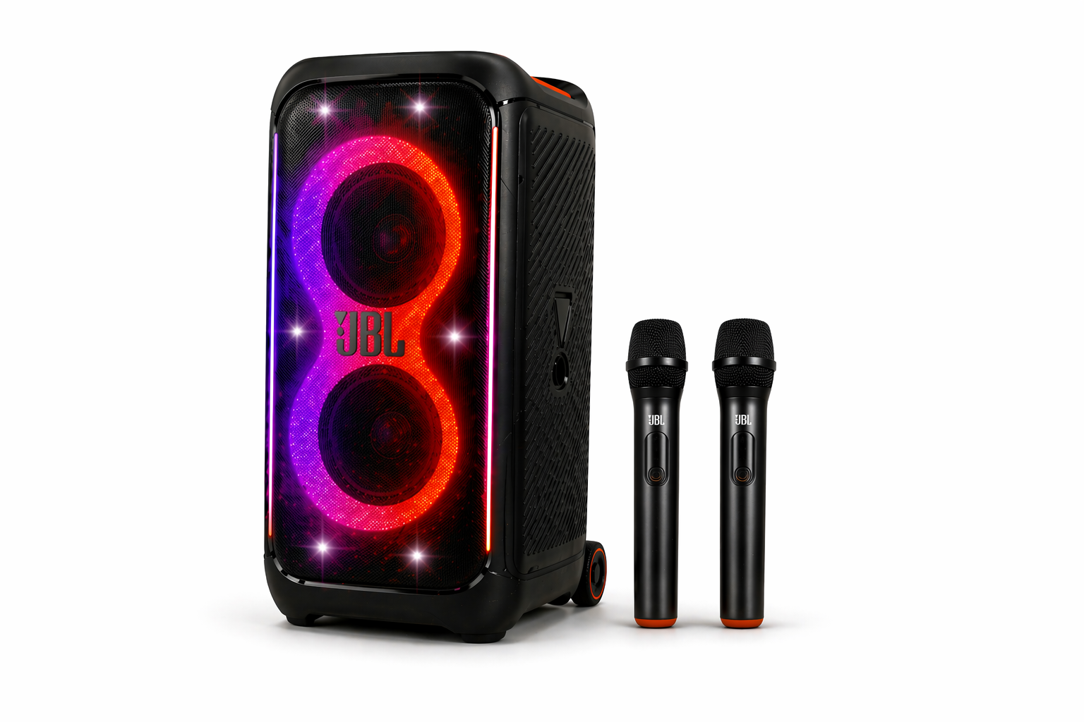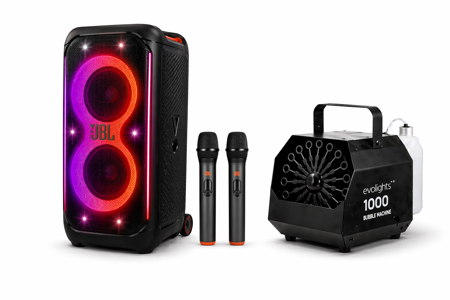PARTY SET č.2 - JBL PPARTY BOX STAGE 320, 2x mikrofony JBL WIRELESS MIC, výrobník bublin Evolights 1000