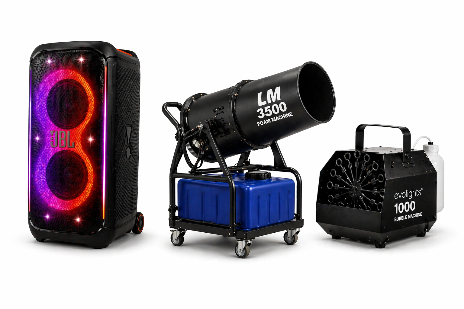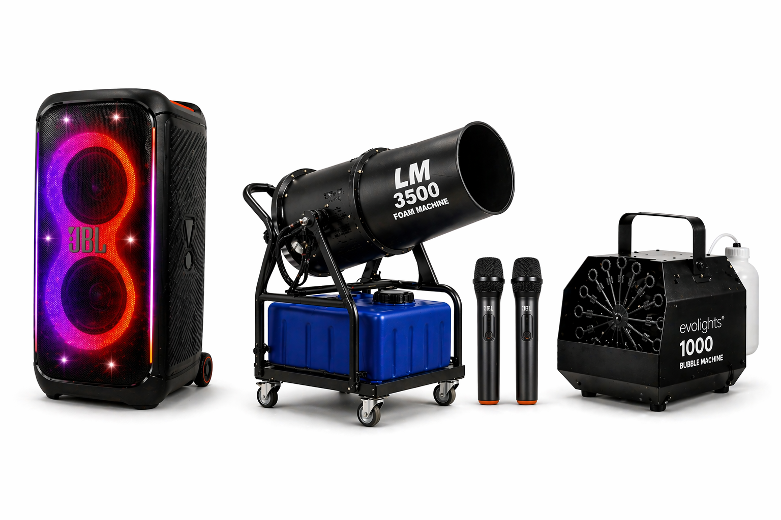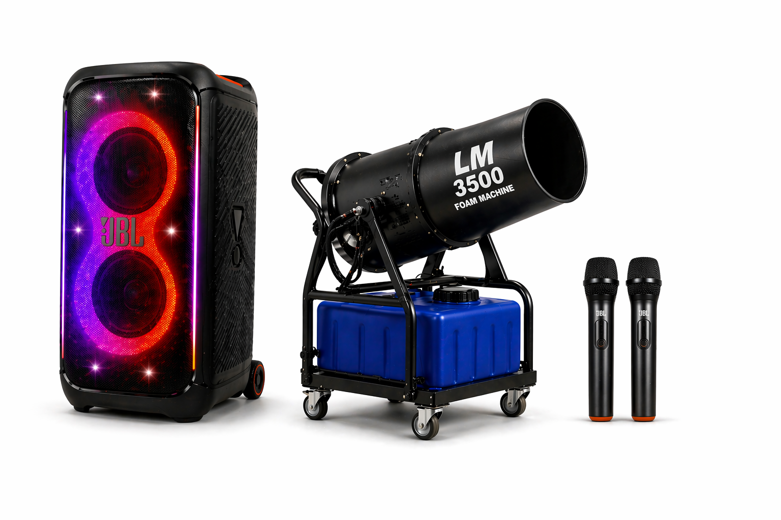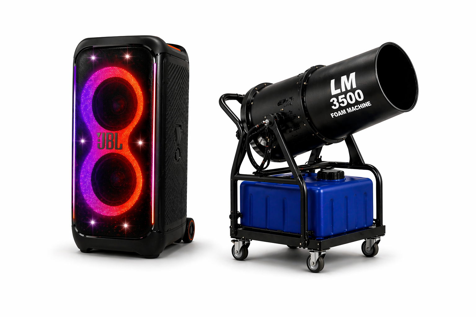 PARTY SET č.7 - JBL PPARTY BOX STAGE 320, výrobník bublin Evolights 1000, pěnové dělo LM 3500